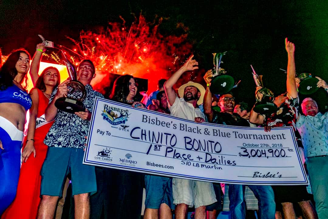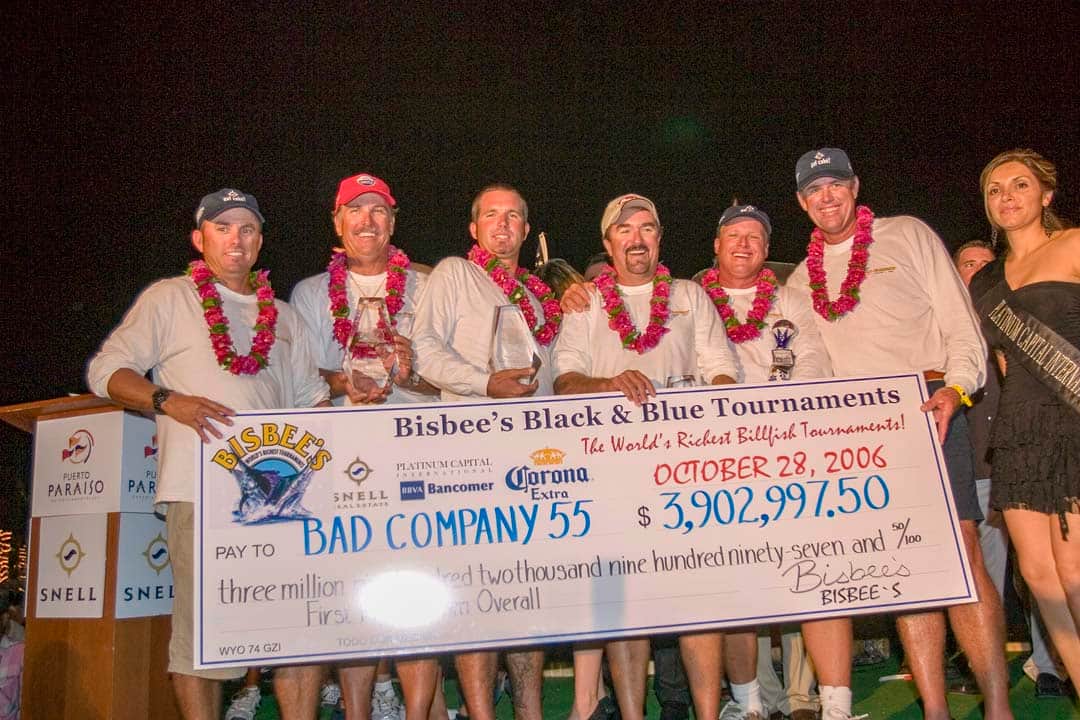 As Cabo San Lucas grew, through the efforts of Wayne and Tricia, the Bisbee Black and Blue continued to grow as well. It soon reached a remarkable milestone of $1,000,000 in total purse, becoming one of the richest tournaments in the world. Then came the first $1,000,000 payout for a blue marlin in 2003, the first $2,000,000 payout in 2005, and the largest single payout in sportfishing history in 2006 at $3,900,000.