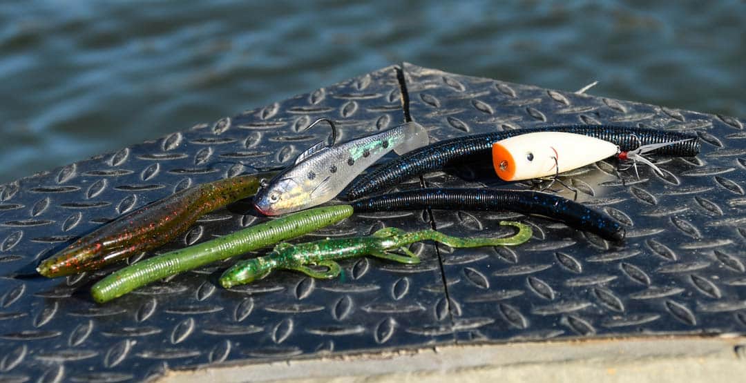 Email the lodge beforehand and ask specifically what lures to bring, and trust your guide when you get there. At Picachos, the bite was on 7-inch blue or green Sinkos and green lizards with a 5/0 worm hook and a 3/8-oz. sinker. Also Pack Pop-R’s and 8-inch green flukes rigged weedless to work shallow timber.