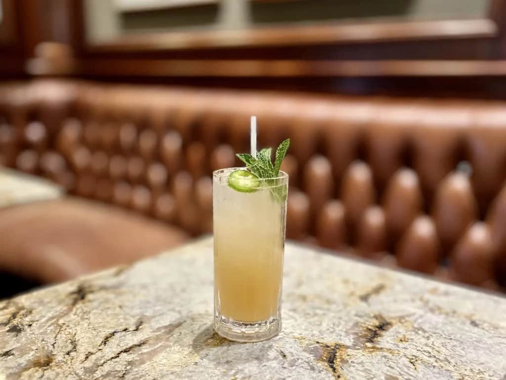 Build over ice in a Collins glass and garnish with a jalapeño round and mint sprig.