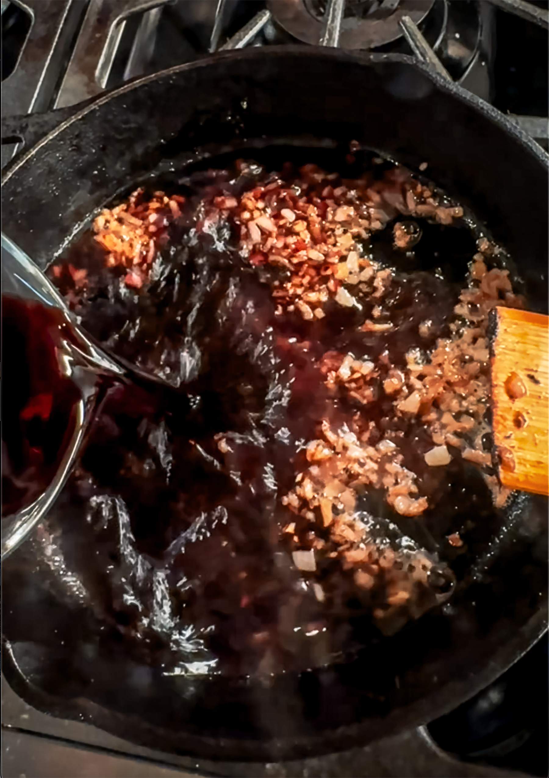 - Deglaze with red wine, scraping the good brown bits at the bottom