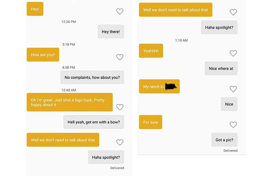 The Oklahoma Game Wardens posted snapshots of the exchange between Harrison and the woman which reveal she had poached a deer outside of rifle season, at night, and with the use of a spotlight—three strikes against the would-be lady love.