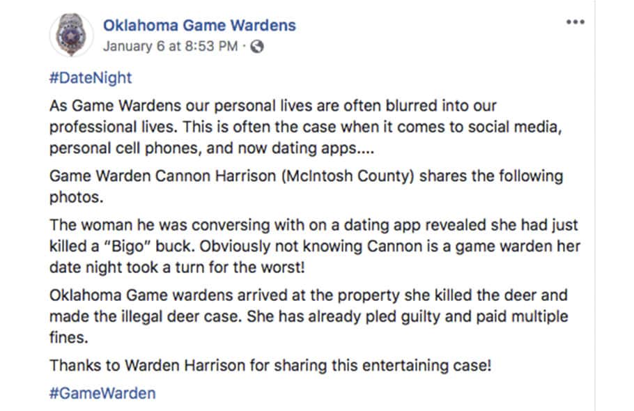 According to a Facebook post by Oklahoma Game Wardens, Cannon Harrison, one of their wildlife officers, encountered a poacher through a random conversation on the dating app Bumble.