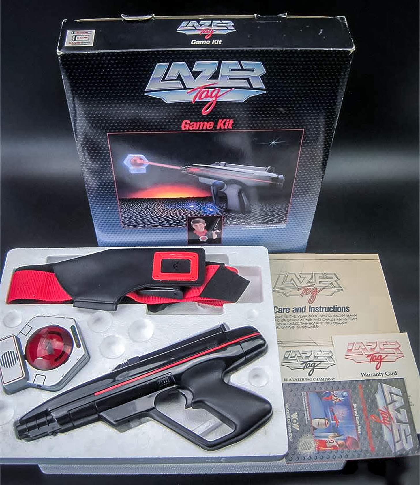 The set you actually got had one gun, one sensor, and a plastic harness kind of thing to wear the sensor, which meant you needed to buy two sets to actually play a game, or you had to know someone with the same set. You could, apparently, but a vest that held the sensor, but I never saw one.