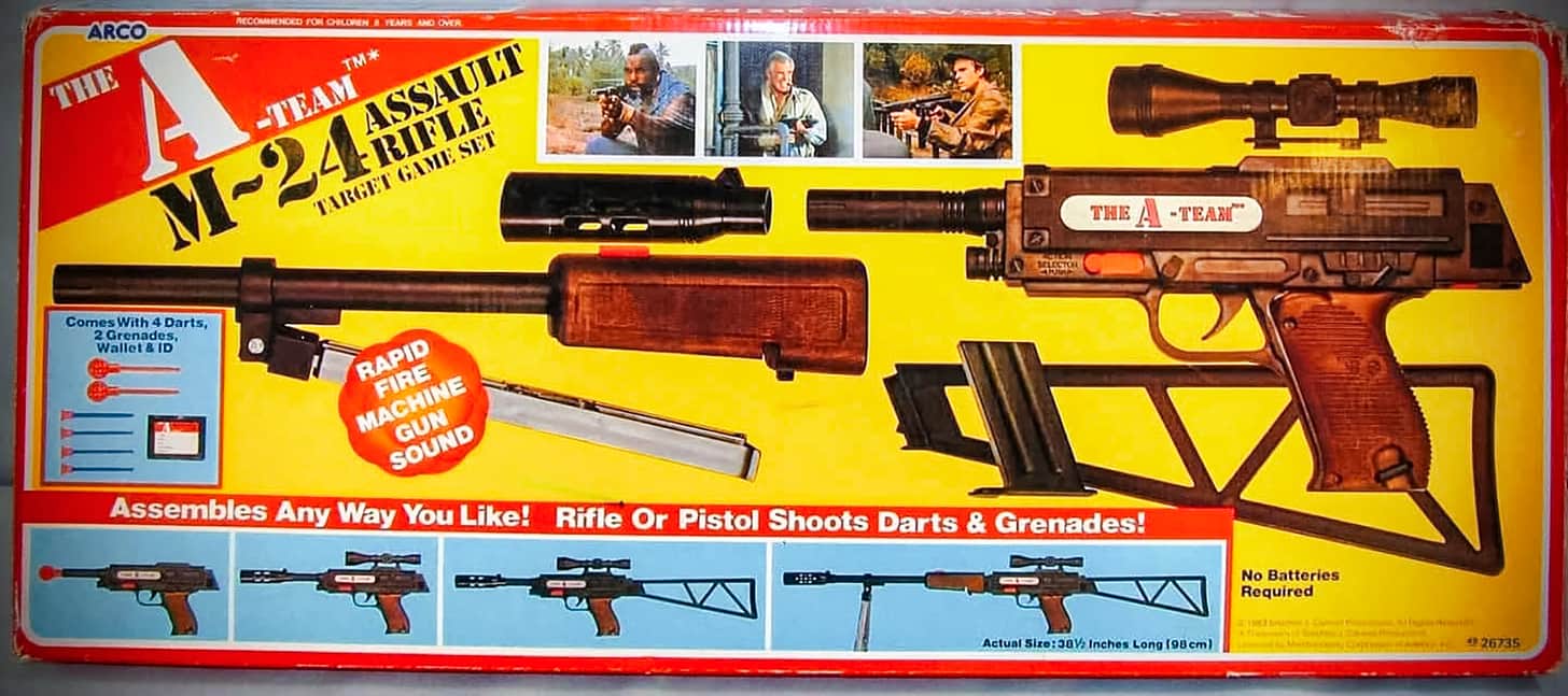 As the 1980s wore on, the A-Team branding was ditched and the same toy gun was released as a Rambo-branded product, but it was entirely the same. They even made a version for the landmark mini-series V (1983).