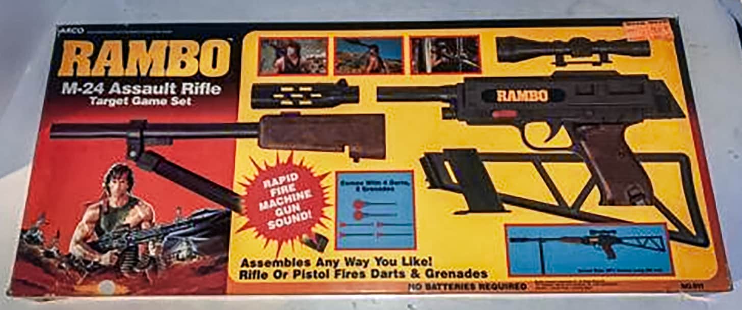 Another of my favorite toy guns also came with a bunch of attachments and configurations. People born a bit before the early 1980s might remember this one as the A-Team branded M-24 Assault Rifle Target Game Set. I had the later Rambo-branded version.