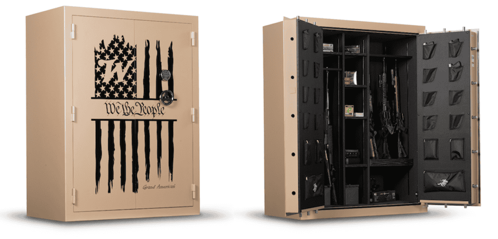 The Grand American Gun Safe by Winchester Safes is the latest in state-of-the-art gun cabinets. It offers sophisticated protection for gun owners. It incorporates premium features, including 10-gauge steel, Palusol heat-expanding door seal, a 60-minute fire rating (at 1,400 degrees Fahrenheit), and more. It can hold up to 60 long guns. It has customizable solutions for other valuables.