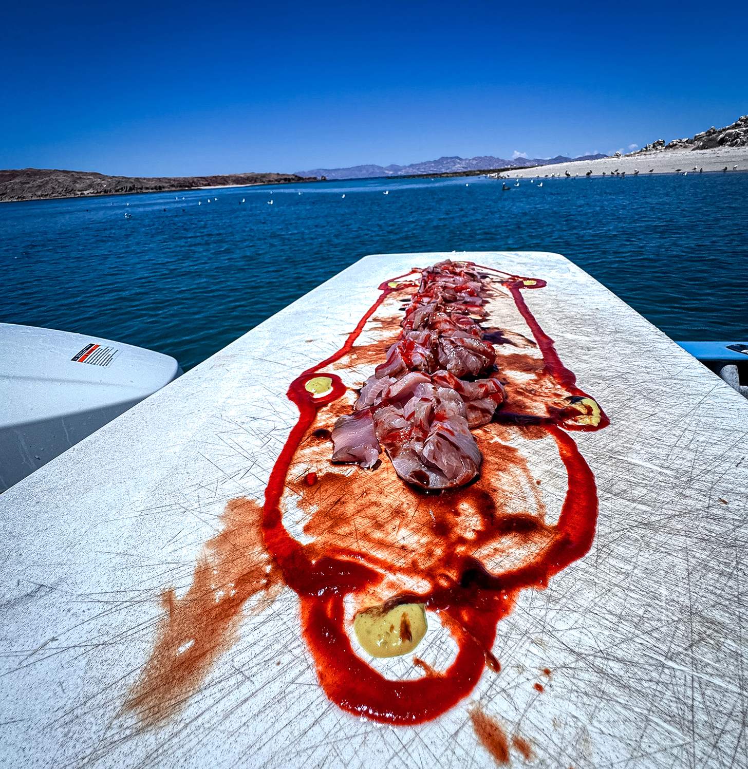 That fish fed the whole crew later that afternoon when we pulled into one of the most picturesque bays I’ve ever seen. Calm water, white sand, and not another soul in sight. We swam, spearfished, and explored the coast barefoot and half-buzzed on salt and sun. Our two boat captains pulled out the knives and went to work, slicing fresh yellowtail sashimi right on top of the cooler lid. They drizzled it with soy sauce, fresh lime juice, and a streak of Sriracha.