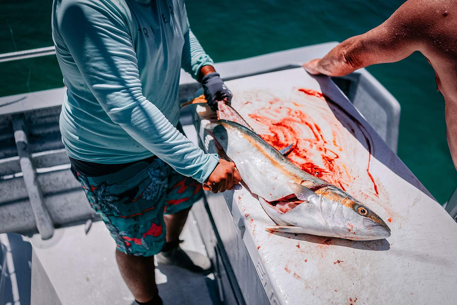 The best fish of the trip came late morning on our second day. We dropped fresh bait on a rocky point, and within seconds, the rod doubled over and the reel started to thump. It wasn’t a long fight, but it was hard. Deep, heavy pulls. No drama. Just torque. When we pulled it over the rail, it was a yellowtail pushing 40 pounds — shoulders like a linebacker, color lit up in the sun.