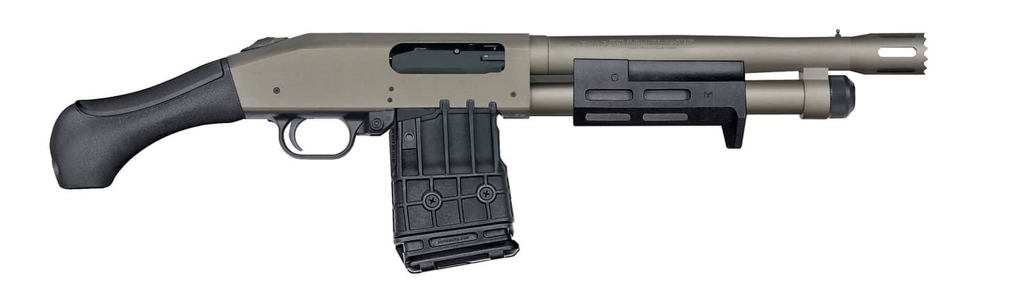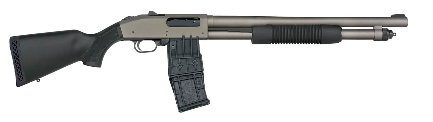 - Two 12-gauge, 2.75-inch magazine-fed pump actions feature an 18.5-inch barrel with integrated heat shield, compact forend, 5-position adjustable stock with interchangeable recoil pad, MOE pistol grip, Picatinny rail, flat profile trigger, rotary safety selector and ship with a 10-round magazine.