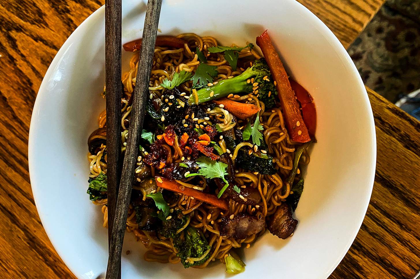 - Garnishes: crunchy garlic, fresh cilantro leaves and toasted sesame seeds
