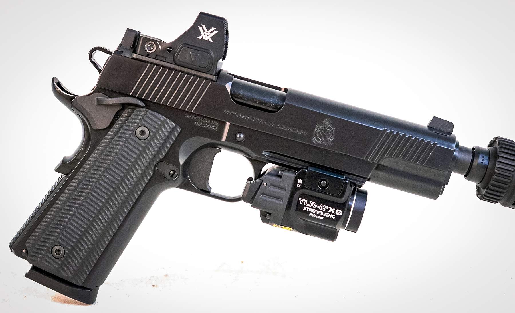 Add these three things together — the Springfield Armory Operator, the Dead Air Mojave 45 sound suppressor, and the Streamlight TLR-8X light/laser — and you have the ultimate close-combat tool.