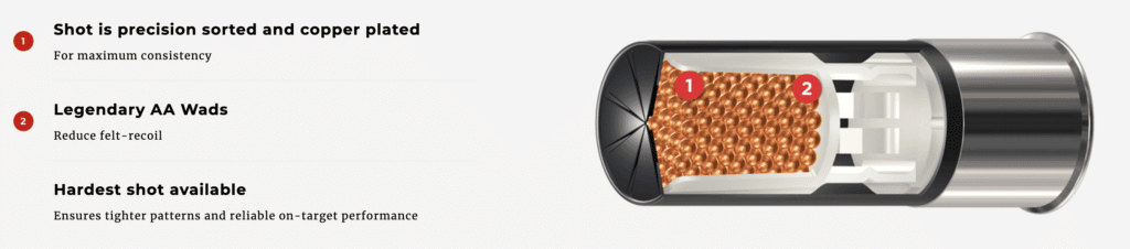 A key differentiator in this target shotshell is the Winchester AA Diamond Grade Shot. The eight percent antimony (hardening alloy) is four times greater than standard target loads, resulting in the hardest copper-plated shot available to target shooters. The shot is also precision sorted, meaning only the roundest shot makes the grade and is used.