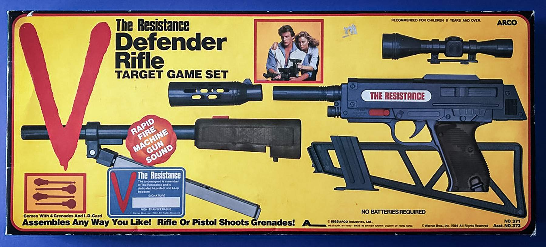 As the 1980s wore on, the A-Team branding was ditched and the same toy gun was released as a Rambo-branded product, but it was entirely the same. They even made a version for the landmark mini-series V (1983).
