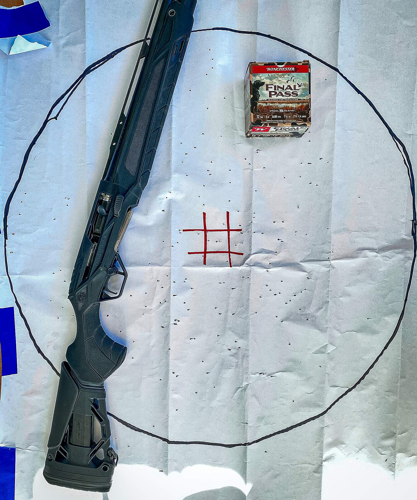 For my patterning evaluation, I used the Modified choke and did all my shooting at 30 yards. I patterned five different 3-inch waterfowl loads, shooting each load three times into large sheets of paper with a center aiming point drawn with a marker.
