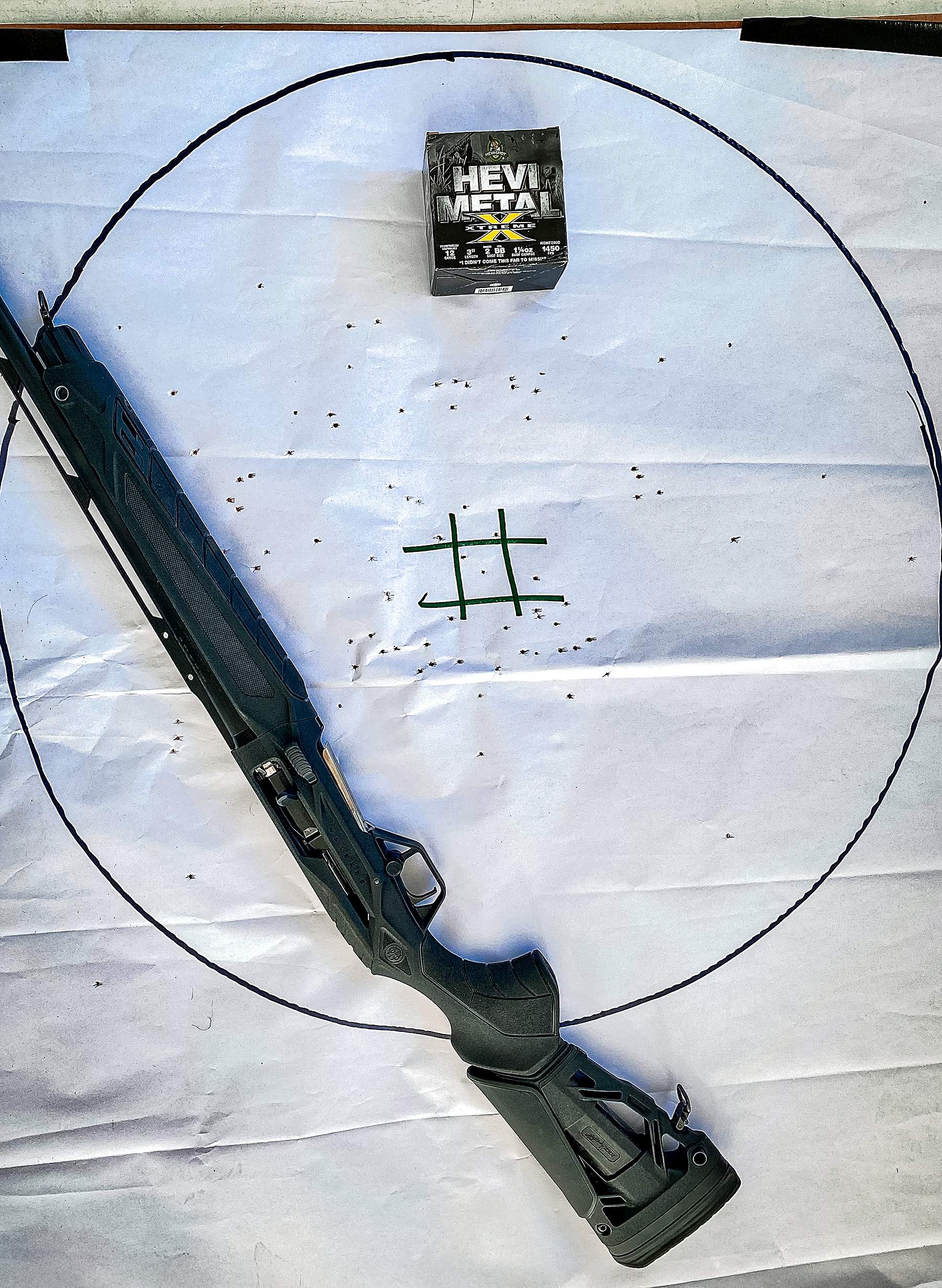 Then, I tried out a HEVI-Metal Xtreme option, the 3-inch shell loaded with No. 2 tungsten and BB steel. My best pattern hit 88 out of 94 pellets.
