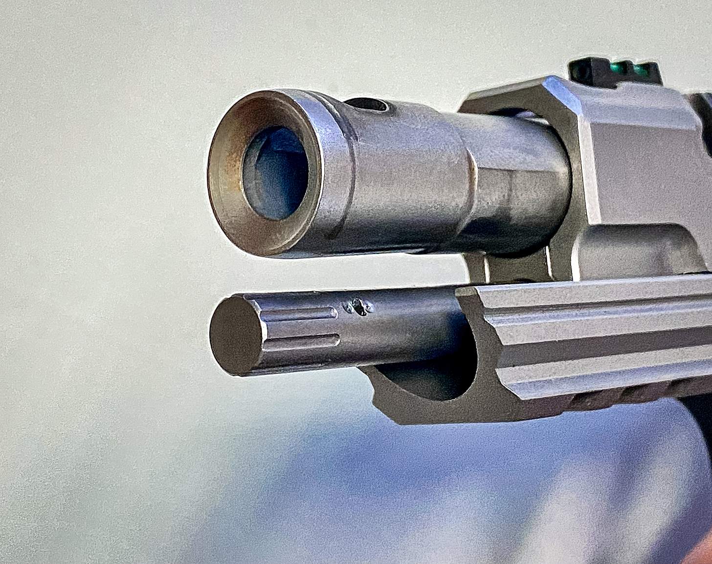 Yet, comparatively, the compensation cuts in the Stainless barrel and slide did minimize muzzle flip. The downward push of those gases escaping the cuts also produced a slight rearward pulse that spread out the felt recoil.