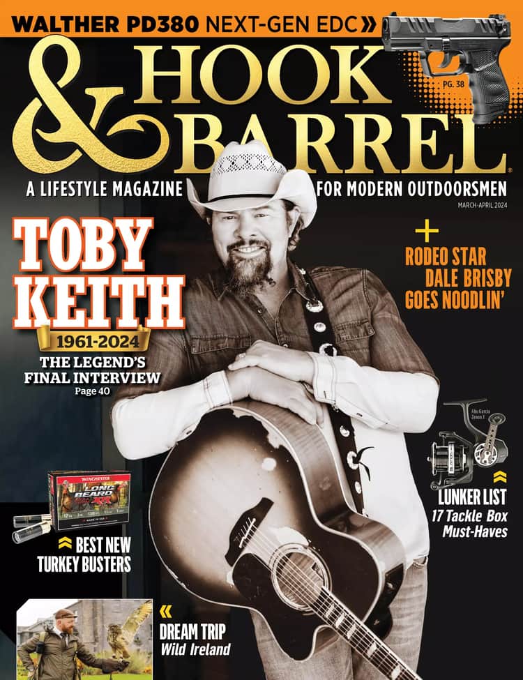 Honor Toby Keith in his final interview, hunt and fish with Dale Brisby, explore the Walther PD380, live the RV life with Harvest Hosts, hunt turkeys at Chimney Rock, and see how Caleb Lee Hutchinson revitalized his music career—and more!
